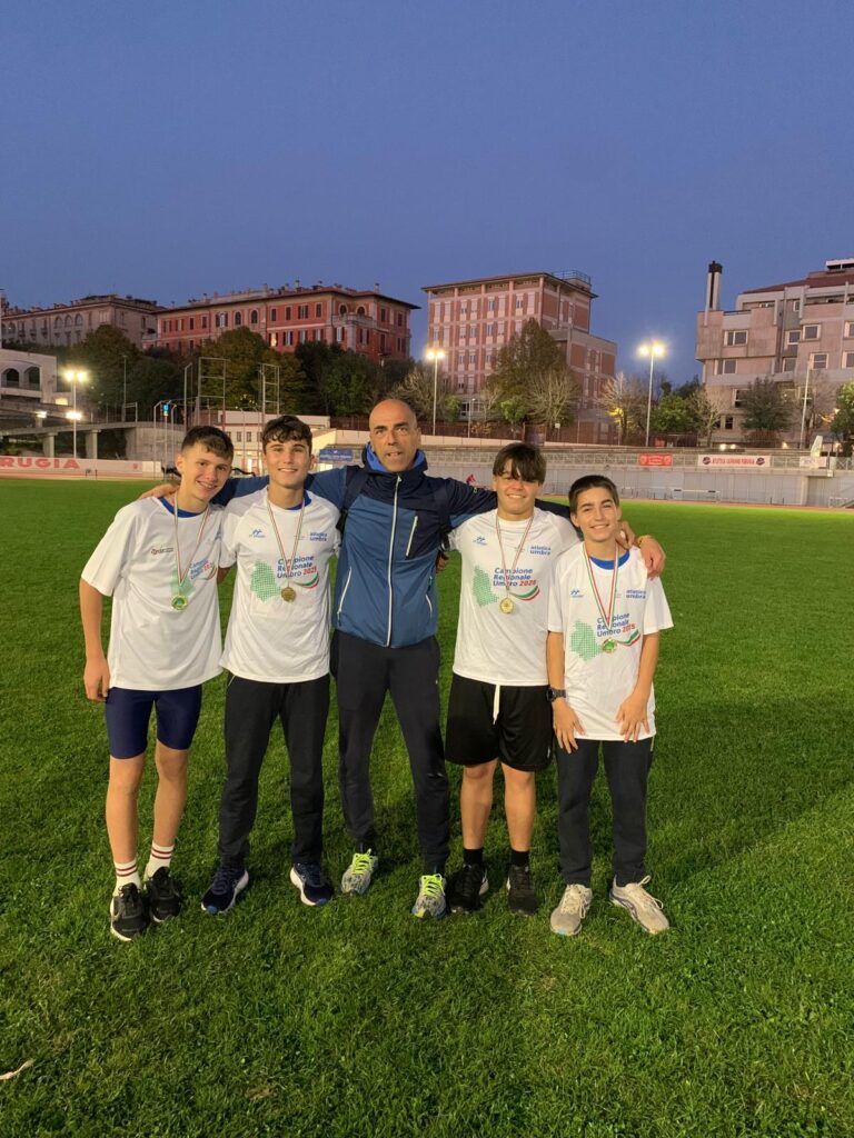 Si è svolto sulla pista del Santa Giuliana di Perugia sabato 18 ottobre 2025, il Campionato Regionale Staffette che conclude l’attività su pista della stagione 2025. La Libertas Orvieto non è mancata all’appello ed è arrivata con una compagine da spettacolo. I ragazzi hanno messo in pista una grande prova di squadra che ha visto la società orvietana conquistare ben 10 titoli Regionali sui sedici disponibili presentandosi anche come società più numerosa dell’Umbria. Tra di dieci titoli da sottolineare quello conquistato dai ragazzi Serranti Riccardo, Sberna Filippo, Nuccioni Alessandro, Tordi Riccardo ( nella foto con l’allenatore Stefano Barbabella) che con il tempo di 52″ siglano anche il nuovo record regionale Categoria Ragazzi abbattendo quello in vigore fatto nel 1994 con una prestazione che sancisce l’assoluto valore del quartetto di atleti di Orvieto.